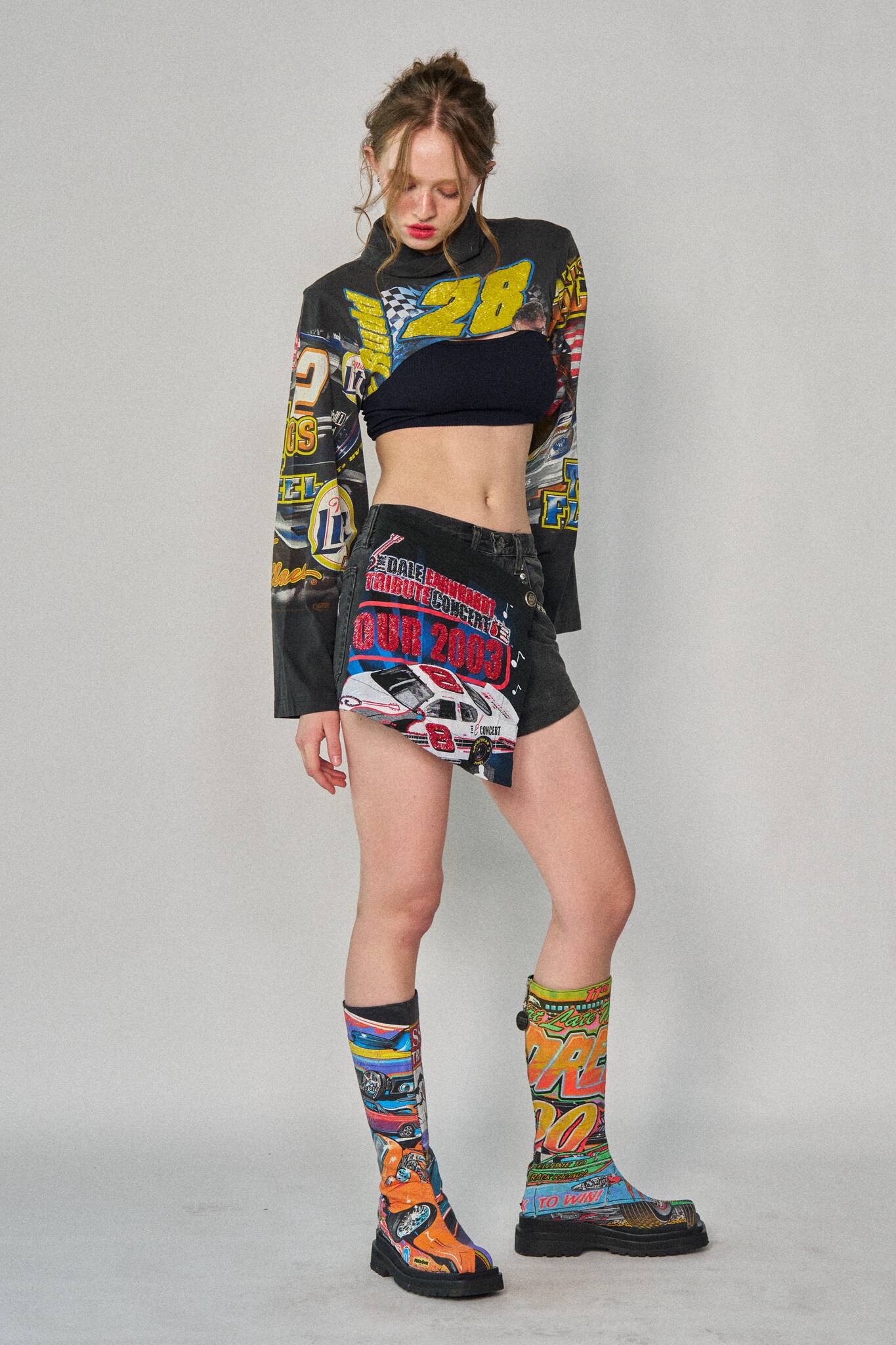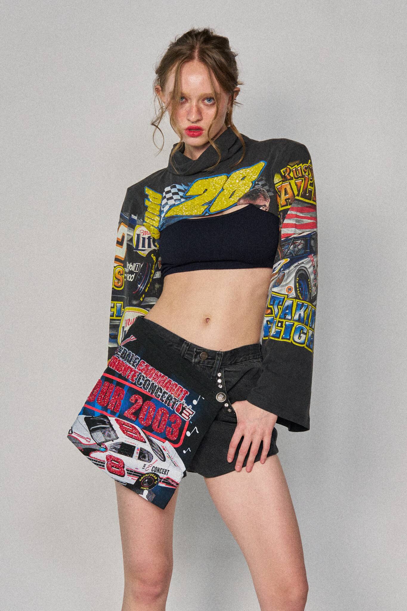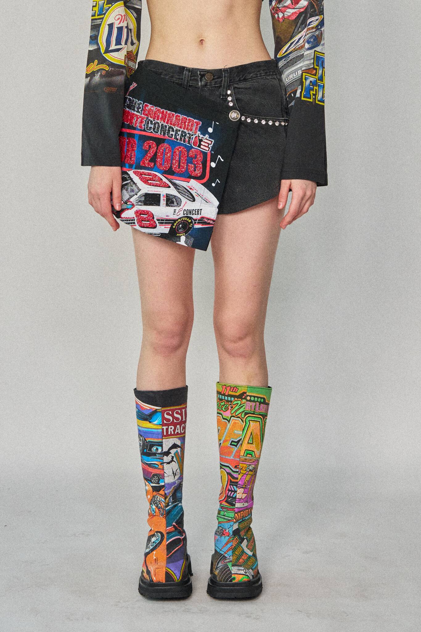 Deconstructed shorts in washed black denim with an asymmetric wrap from upcycled racing tees. Finished off faux diamond stud liners at the front pockets.