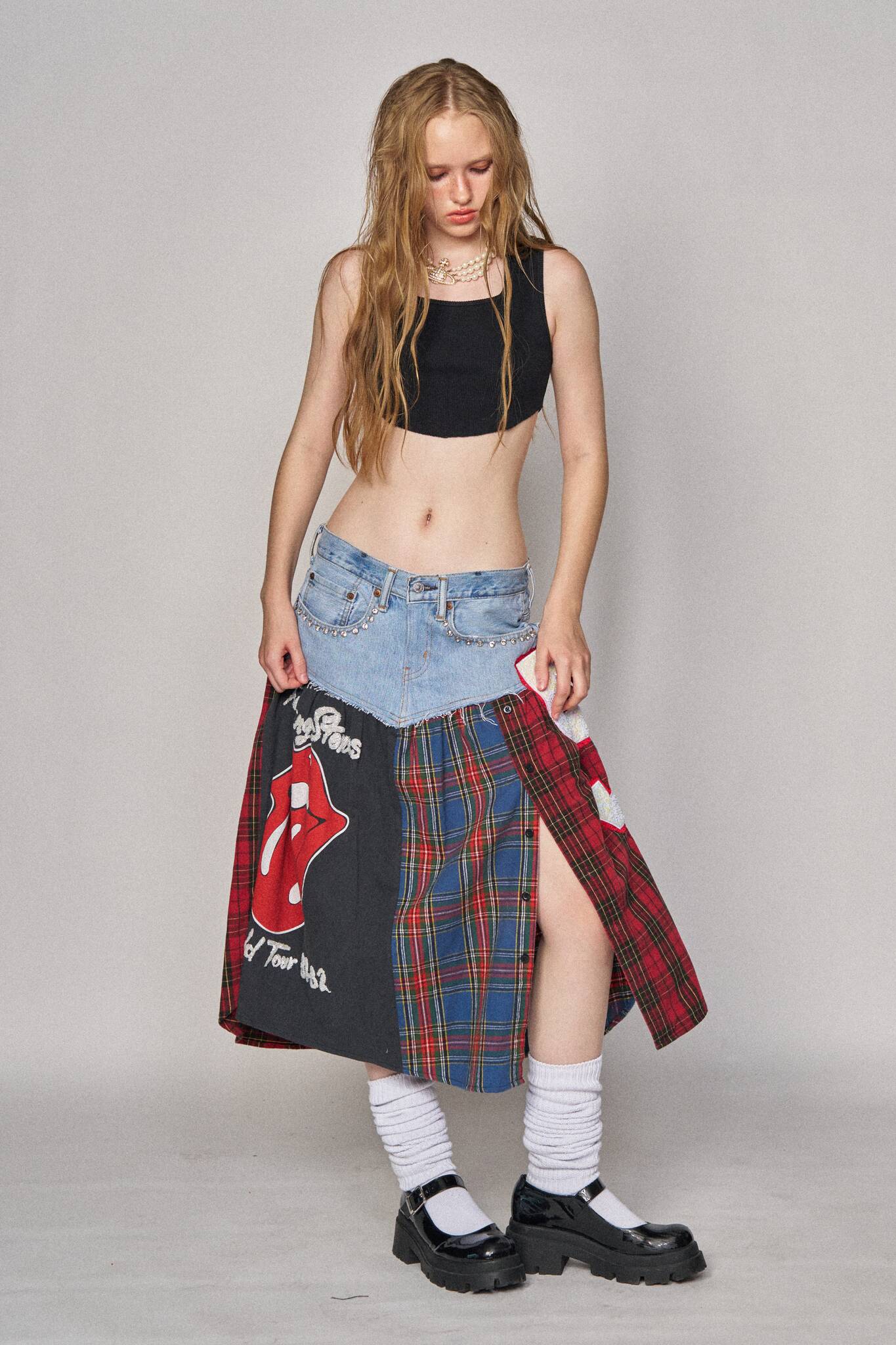 Handcrafted from reworked denim, mixed plaid shirts, and vintage band tees. Our Even Flow Skirts mixes the aesthetic and attitude of the 90s grunge era with additional shine from our hand sequined varsity numbers. Features a mid-rise fit and rests comfortably at the waist/upper hip. True to size with a fluid drape.