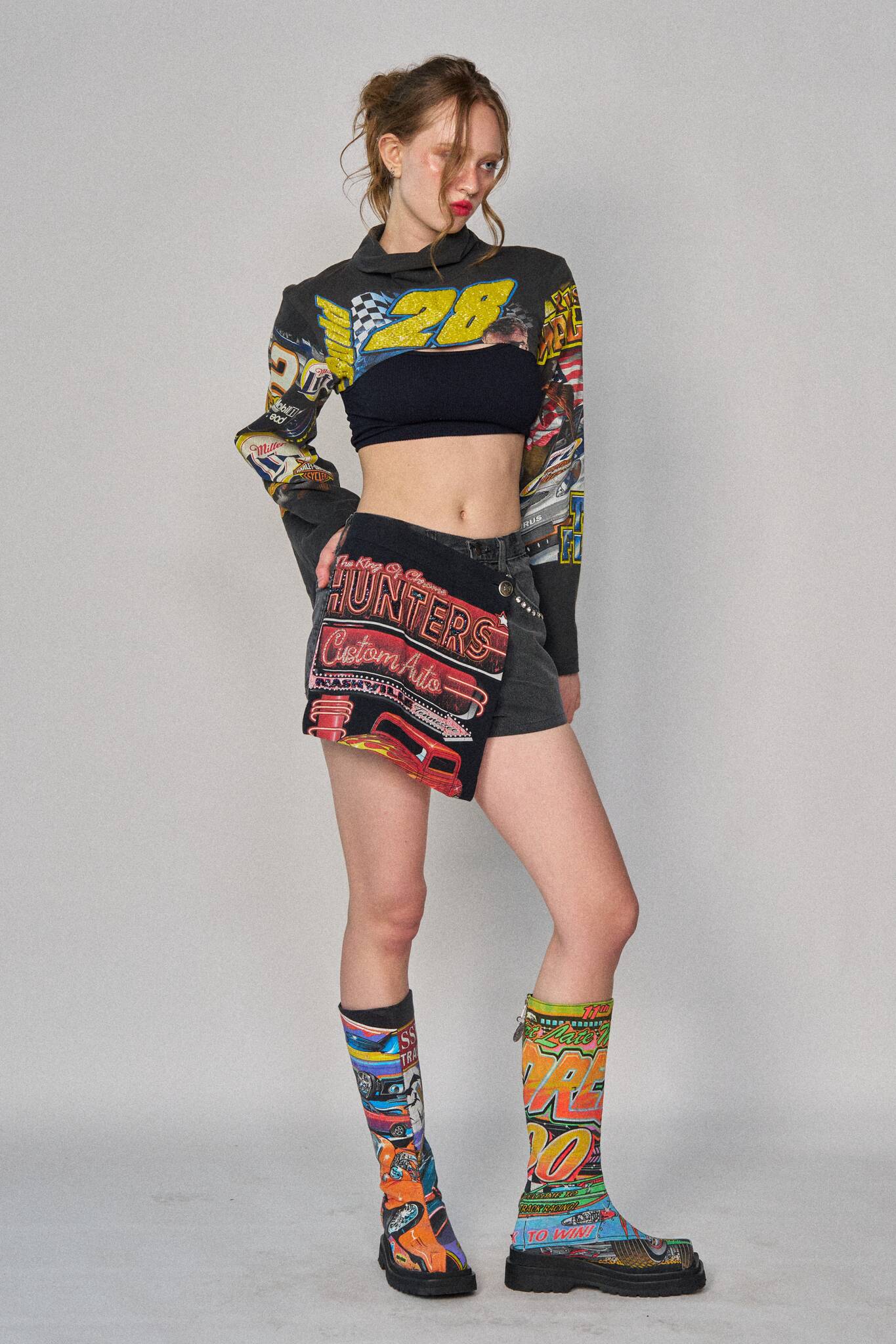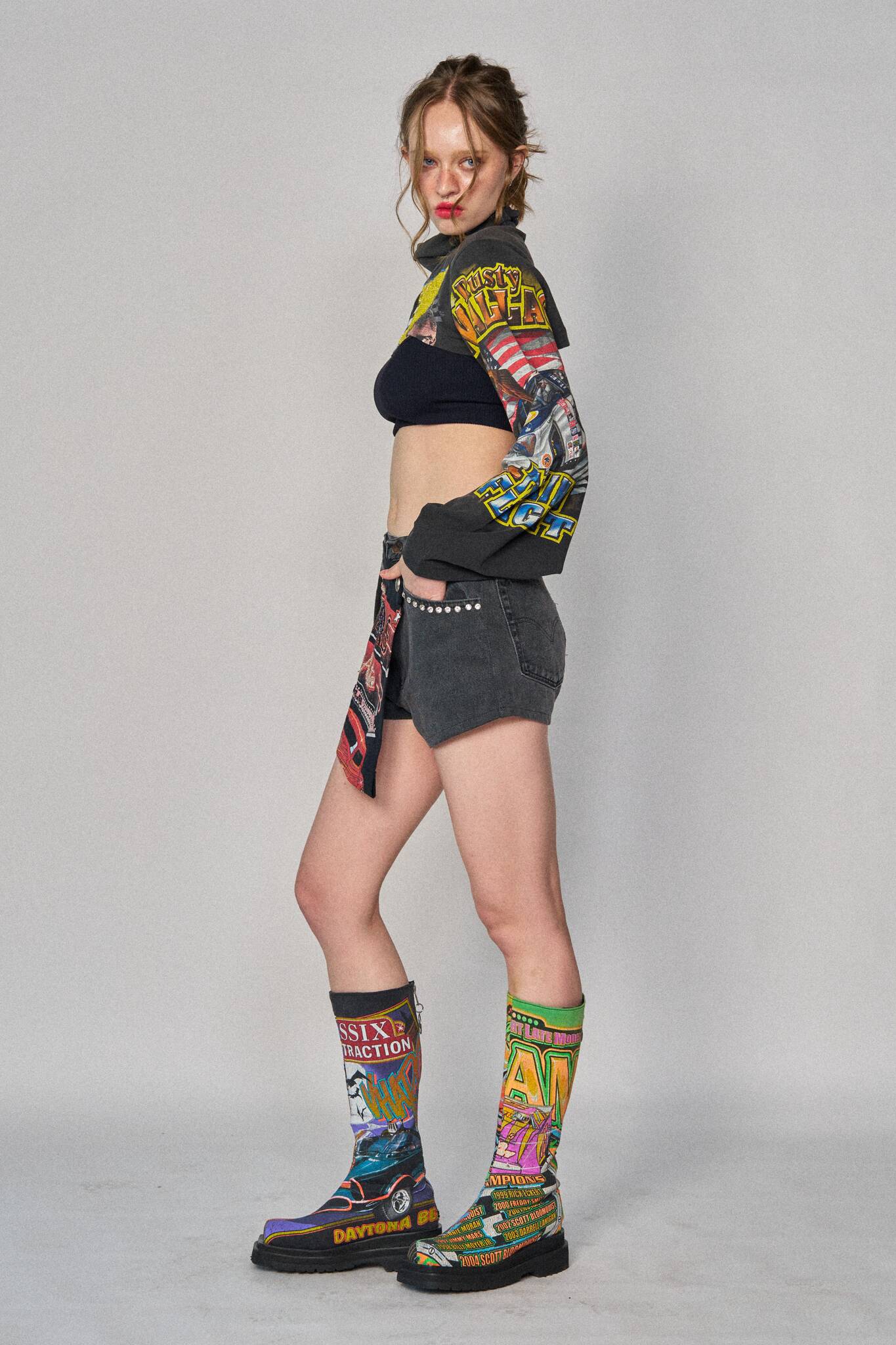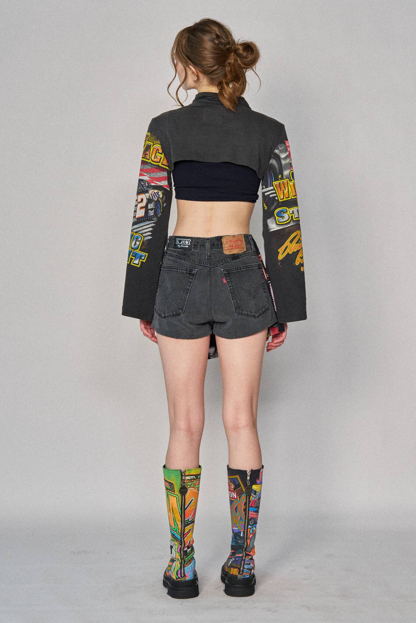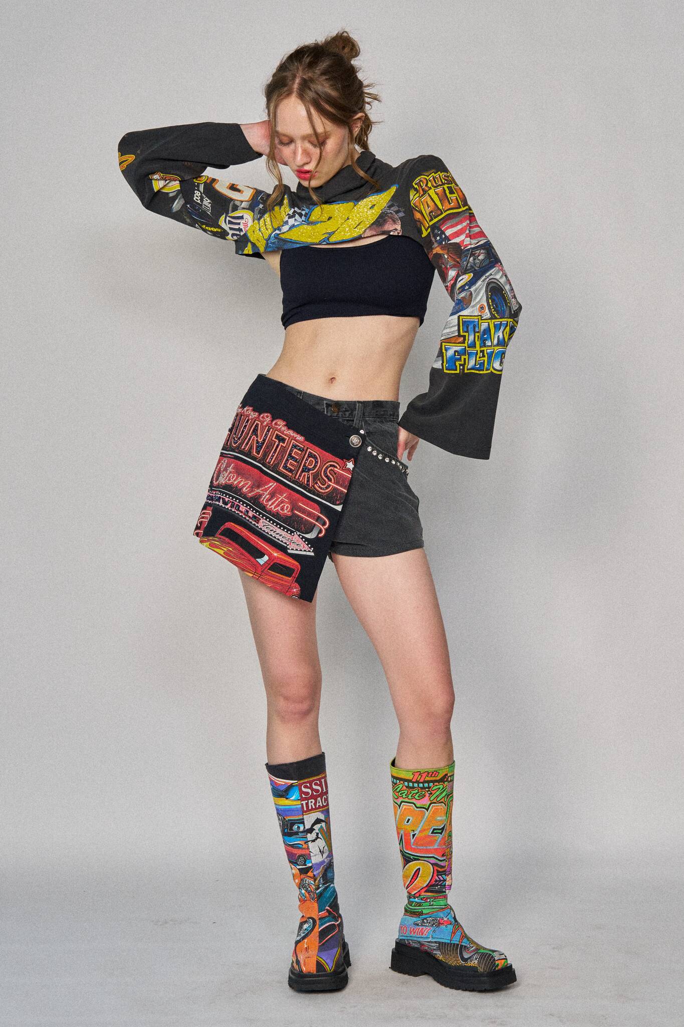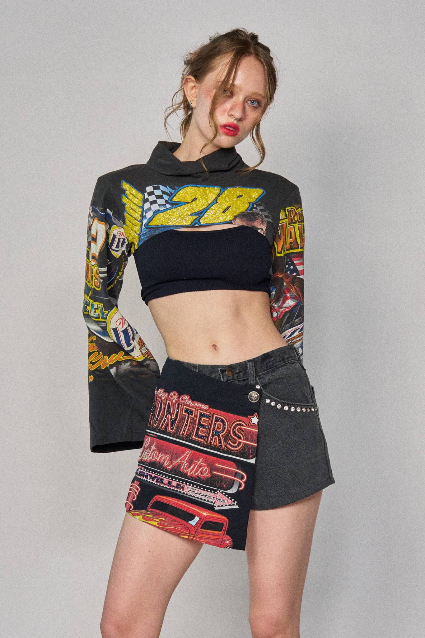 Deconstructed shorts in washed black denim with an asymmetric wrap from upcycled racing tees. Finished off faux diamond stud liners at the front pockets.